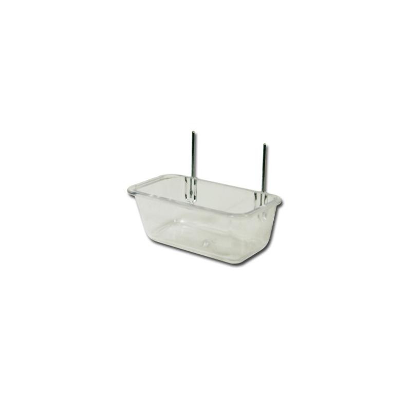 Comedero de plástico resistente con ganchos metálicos. Sus dos ganchos permiten adaptarla a cualquier tipo de jaula y retirarla con comodidad para una limpieza y una desinfección rápida.