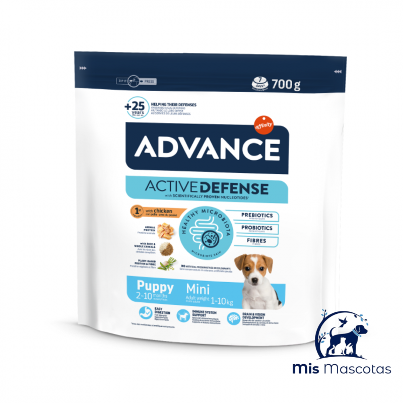 Advance Mini Puppy es un alimento de alta gama formulado para cubrir sus necesidades nutricionales específicas favoreciendo el máximo desarrollo de su sistema digestivo e inmunitario, reforzando sus defensas y garantizando el correcto desarrollo de sus huesos, con un alimento fácil de digerir. Además el tamaño de las croquetas de Advance Mini Puppy se adapta al tamaño de la mandíbula tu cachorro Mini. Advance Puppy Mini está especialmente indicado para cachorros de raza pequeña de 2 a 10 meses de edad.