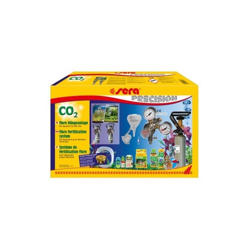 (21,8 x 14). Recargable. • sera flore reductor de presión de CO2 reductor de presión fabricado en Alemania, con válvula de aguja de precisión. Reduce la presión de la botella (aproximadamente 50 – 60 bar) a la presión de funcionamiento necesaria (0,1 – 2,5 bar). • sera flore difusor de CO2 a presión permite la máxima disolución de CO2 en el agua y evita, así, las pérdidas de CO2 • tubo para CO2 (5 m) y válvula antirretroceso evita la entrada de agua del acuario en el sistema de abonado con CO2 • sera test permanente de CO2 para el control permanente del contenido de CO2 en el agua • sera florena 100 ml y sera flore daydrops