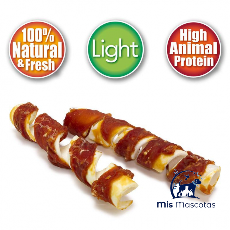 COMPOSICIÓN: Pato 40%, piel bovina 52%, almidón de maíz 2%, proteína de soja 1,5%, emusionante de glicerina 2,2%, edulcorante sorbitol 2%, sal 0,2%. Aditivos: Conservante Sorbato de Potasio 0,1% (E-202).