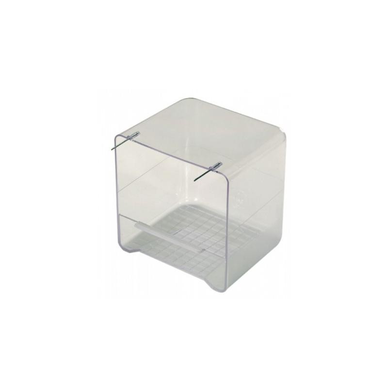 Bañera de plástico para colocar en el exterior de las jaulas de los pájaros, gracias a los enganches que dispone.