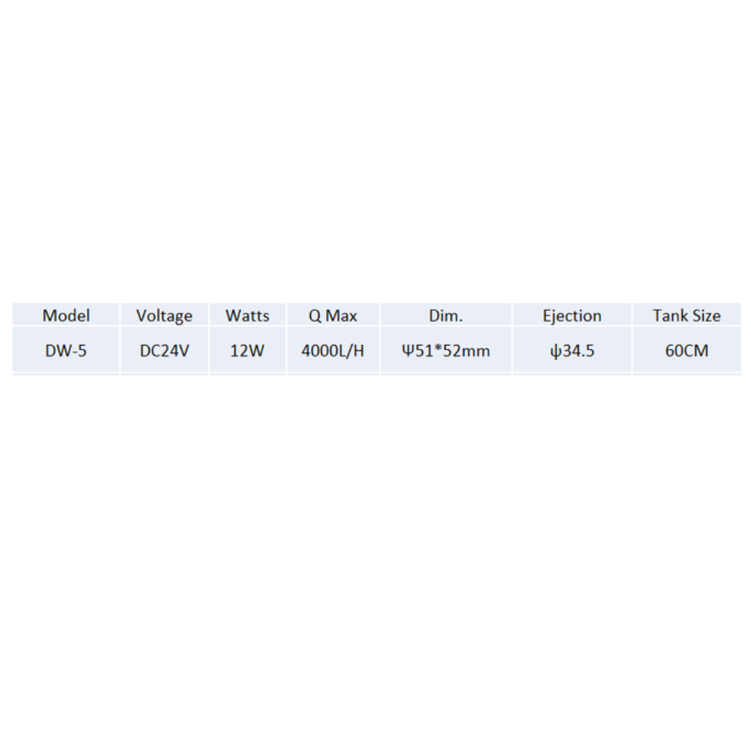 La SDW-5 tiene una salida máxima de 4,000 Lph, y mide 50.8 mm de largo con un diámetro de 44,45 mm. El imán externo funciona en vidrio de hasta 9.5 mm.