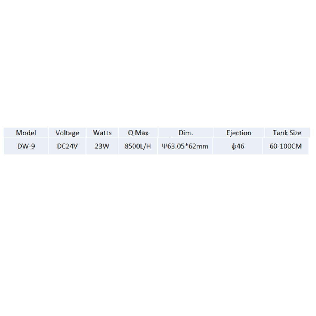 La SDW-9 tiene una salida máxima de 8,500 Lph, y mide 63,5 mm de largo con un diámetro de 50,8 mm. El imán externo funciona en vidrio de hasta 12,5 mm.