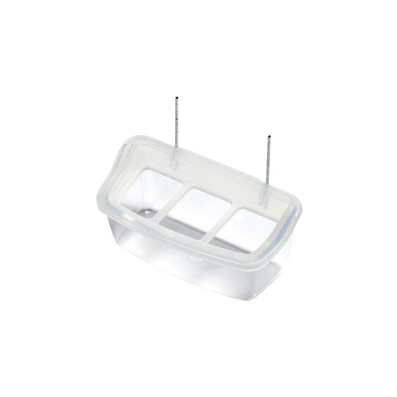 Comedero de plástico resistente con ganchos metálicos para el interior de la jaula de los pájaros, tiene incorporado una rejilla en la parte superior para evitar los derroches de comida.