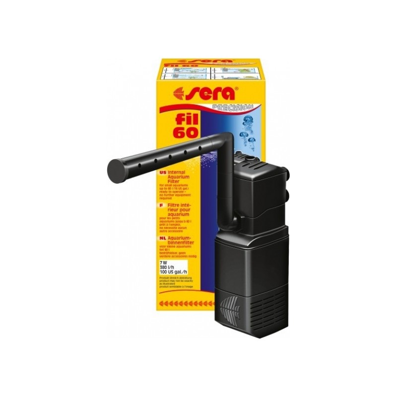 respectivamente. Se pueden montar fácilmente en el cristal del acuario con la ayuda de ventosas. Los filtros están listos para el uso, equipados con material de filtrado (sera fil 60: carbón activado y esponja; el sera fil 120 incluye, adicionalmente, el sera siporax mini Professional) y aseguran un agua cristalina en el acuario. Los filtros se pueden fijar en posición vertical o horizontal y también son adecuados para acuaterrarios. Incluyen un tubo perforado,