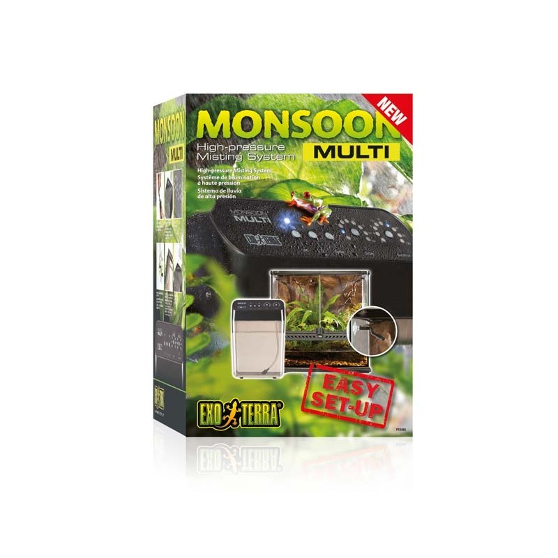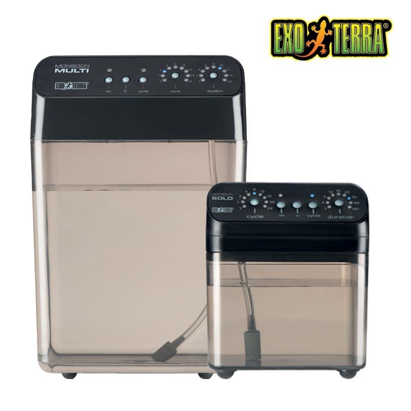 El Monsoon de Exo Terra es un sistema de lluvia programable apto para todos los tipos de terrarios e invernaderos. Ayuda a mantener una óptima humedad mediante la generación de precipitaciones en intervalos programados, la duración y frecuencia puede ser fácilmente ajustado en función del tipo de animal o plantas alojados.
