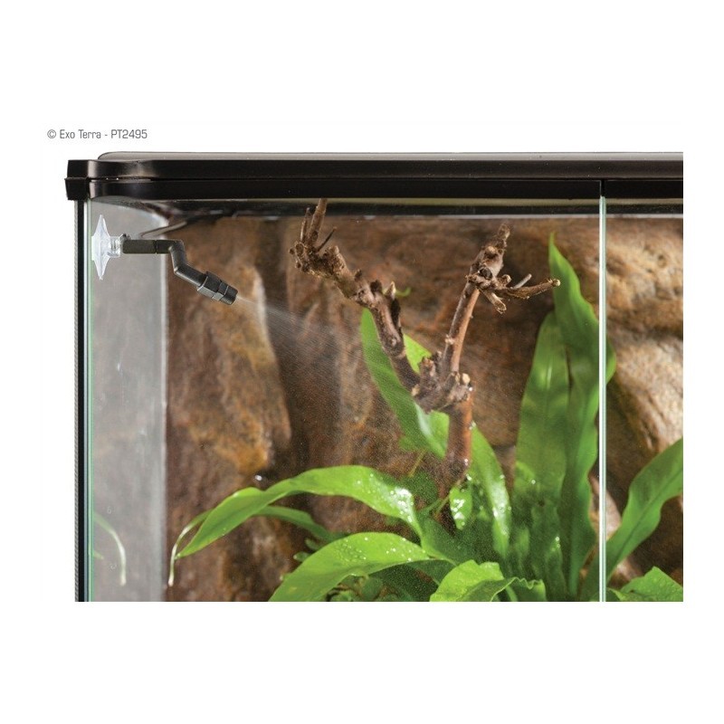 El Monsoon Exo Terra viene con boquillas fáciles de instalar, pero el sistema se puede ampliar para dar cabida a un máximo de 6 boquillas en el caso del Monsoon Multi y hasta 2 boquillas en el caso del Monsoon Solo, lo que es ideal para terrarios múltiples. (Ten en cuenta que cada boquilla adicional resultará en menos de rendimiento de cada boquilla instalada.) Estas boquillas están especialmente diseñadas para que la lluvia sea extremadamente fina, creando un efecto parecido a la niebla en el terrario o invernadero, y el tubo extra largo hace que sea posible ocultar la unidad en un área de almacenamiento o en la mesa del terrario.