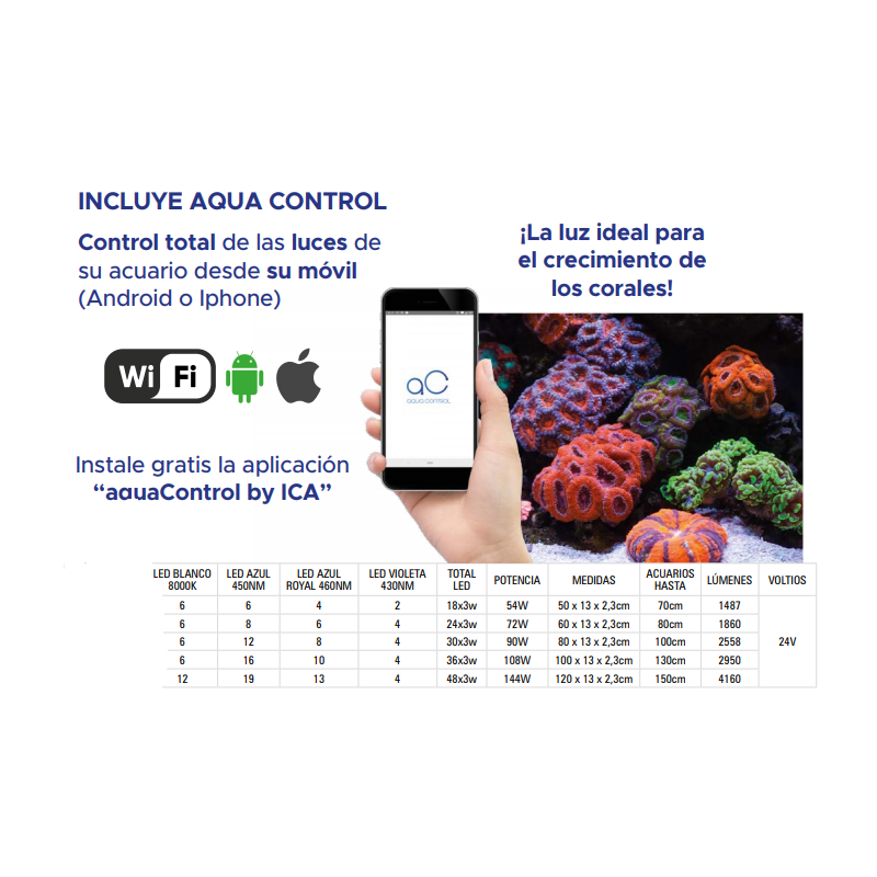 Este nueva versión mejora diversos aspectos para convertirla en una gran pantalla, su espectro específico y la longitud de ondas LEDs azules y violetas promueven el crecimiento y la pigmentación en los corales, reduce y combate la aparición de algas gracias a que el espectro de luz no es óptimo para su crecimiento. Incluye el nuevo aquaControl que nos permite controlarla desde el móvil, modo nube, modo tormenta, totalmente dimeable con 24 posibles configuraciones, una gran pantalla con los últimos avances tecnológicos.