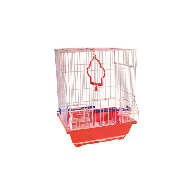 Jaula para aves pequeñas. Con techo plano. Incluye: bebedero , comedero, 2 barras de plástico y columpio con campana. Bandeja extraible. Medidas 30 x 23 x 39 cm