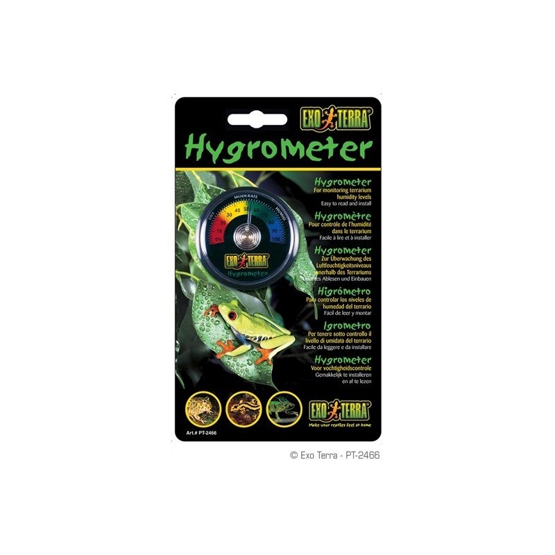 El higrómetro redondo analógico de Exo Terra mide la humedad relativa dentro del terrario.