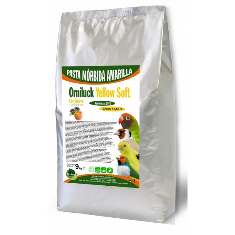 Pasta Orniluck Amarilla Morbida con Cardo Mariano, huevo, ideal para cría, muda y mantenimiento.