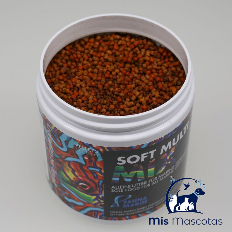 Fauna Marin Soft Multi Mix incluye gránulos que varían en tamaño de 1 a 1.8 mm y contiene un alto porcentaje de proteínas.