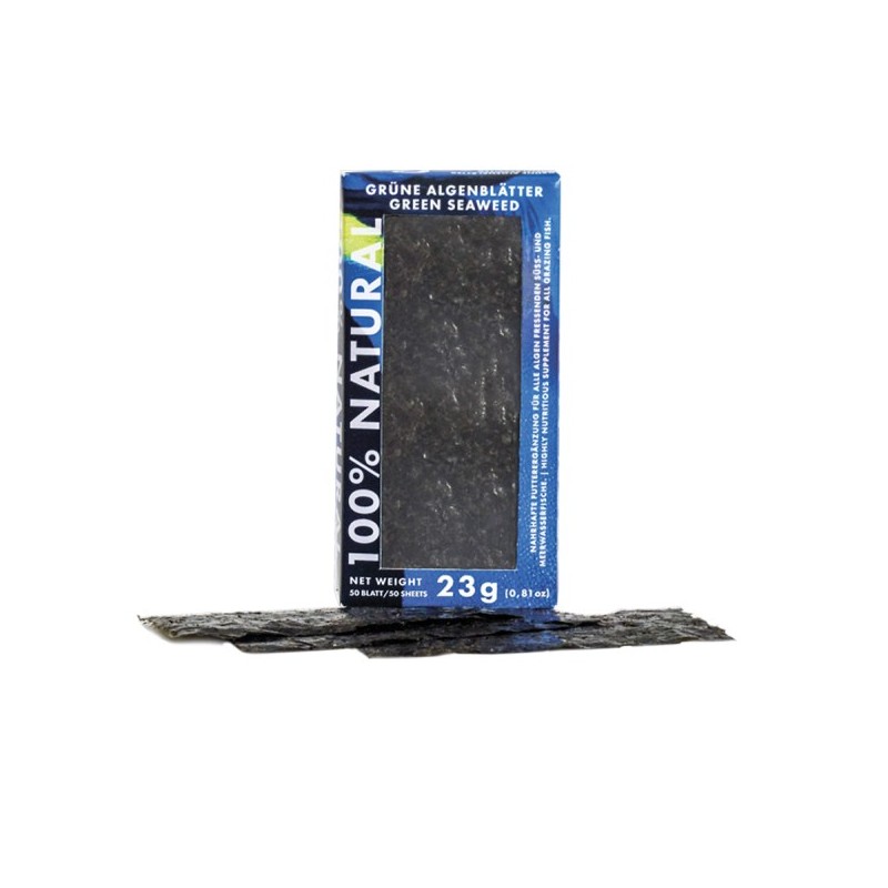 Las láminas de algas se pueden alimentar a diario. Simplemente corte pequeños trozos, remoje brevemente en agua fresca y vierta directamente en el tanque o adhiéralo a una piedra con una banda de goma.