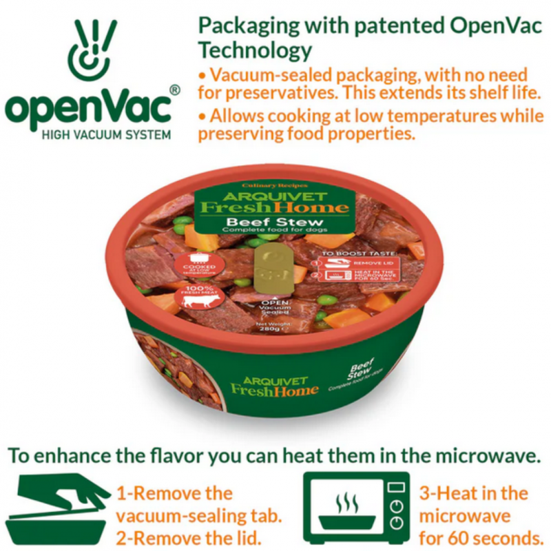Envase con Tecnología patentada OpenVac. Sellado al vacío sin necesidad de conservantes, prolongando así su vida útil. Permite cocinar a baja temperatura preservando las propiedades de los alimentos.