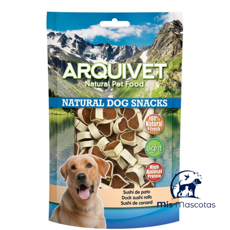 Snack en forma de sushi, con carne de pato. 100% natural. Con un alto contenido en proteína animal y con pocas grasas (Producto Light). Alimento complementario para su perro, muy rico en nutrientes.
