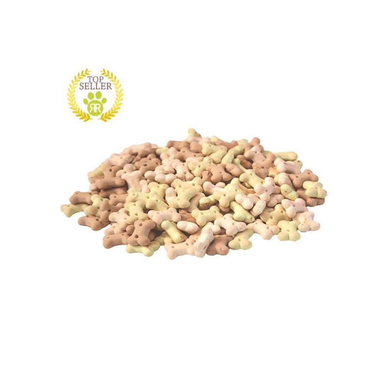 Galletas para perros en forma de hueso con colores surtidos y sabor a vainilla y caramelo. Ideales para premiar a nuestros perros.