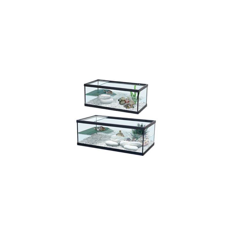 Tortuguera de cristal de color negro con rampa.